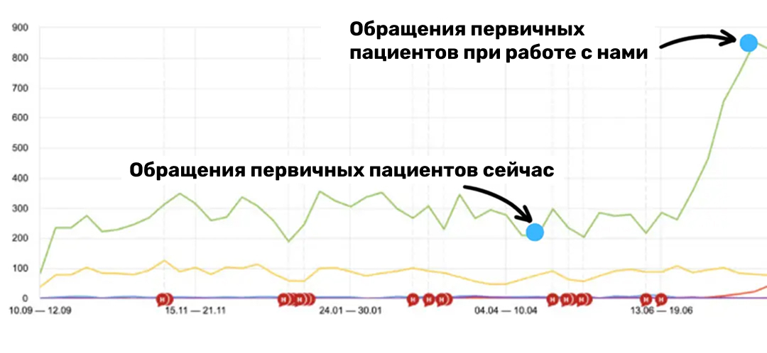 Но фишка в том, что если вы начнете сегодня, то очередь из пациентов у вас будет через 6 месяцев, а не через 2 года. И чем раньше вы начнете, тем дешевле вам обойдется захват рынка (SEO-ставки тоже растут).